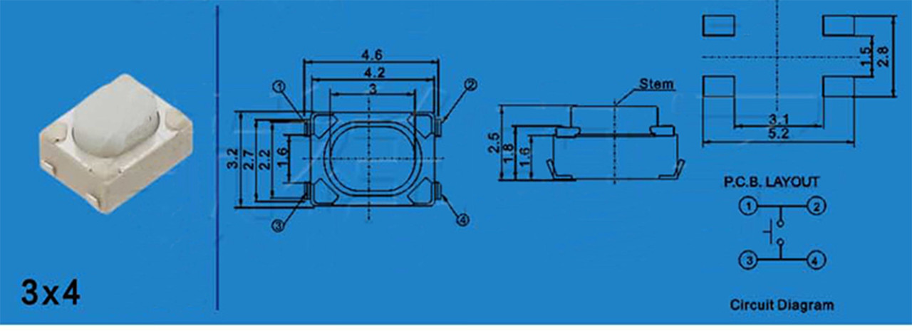 Кнопка метал-пластик високої якості, легкий дотик. Тактова кнопка 3*4 мм.